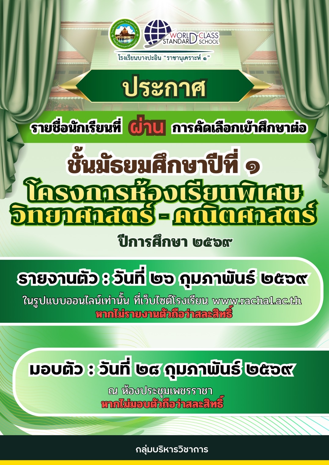 10/2569 แต่งตั้งคณะกรรมการดำเนินการรับนักเรียน รับรายงานตัว และรับมอบตัวนักเรียน โครงการห้องเรียนพิเศษ วิทยาศาสตร์ - คณิตศาสตร์ ชั้นมัธยมศึกษาปีที่ ๑ ปีการศึกษา ๒๕๖๙