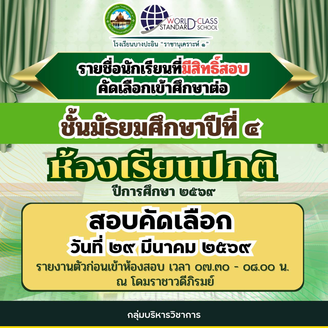 533/2568 แต่งตั้งคณะกรรมการคัดเลือกนักเรียนเข้าเรียนต่อชั้นมัธยมศึกษาปีที่ ๔ (ม. ๓ เดิม) ปีการศึกษา ๒๕๖๙