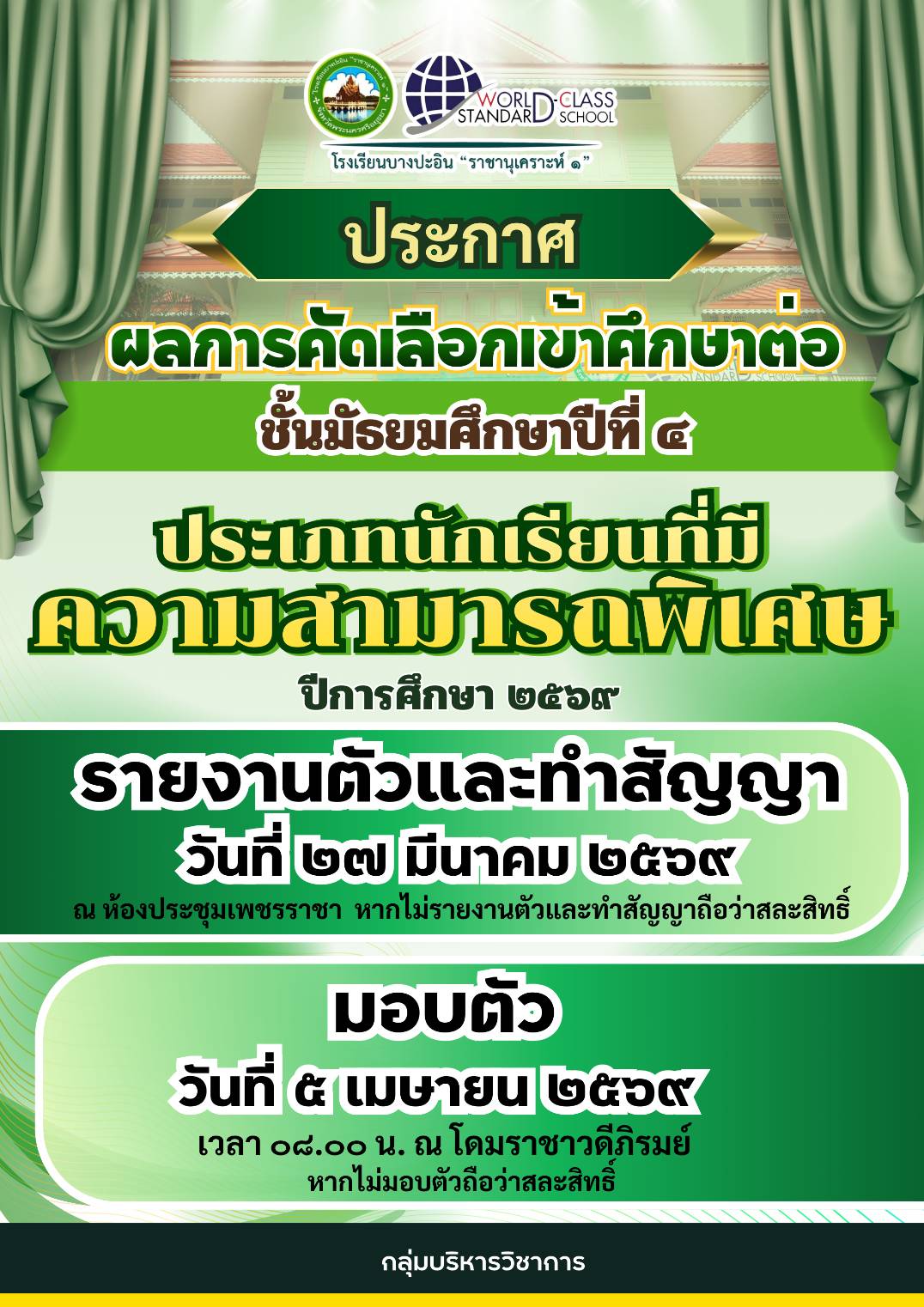 10/2569 แต่งตั้งคณะกรรมการดำเนินการรับนักเรียน รับรายงานตัว และรับมอบตัวนักเรียน โครงการห้องเรียนพิเศษ วิทยาศาสตร์ - คณิตศาสตร์ ชั้นมัธยมศึกษาปีที่ ๑ ปีการศึกษา ๒๕๖๙